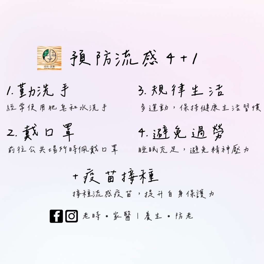 身心保健§2 預防流感4+1 「不會吧,感冒也有跟流行的喔!」 時序入秋,流感病毒蠢蠢欲動,來看看預防流感的小撇步: 勤洗手,經常使用肥皂和水洗手。 戴口罩,前往公共場所時佩戴口罩。 規律生活,多運動,保持健康生活習慣。 避免過勞,充足睡眠,避免精神壓力。 +疫苗接種,接種流感疫苗,提升自身保護力。 「明日無憂老後‧此刻慢活養生」 了解更多養生防老大小事,好對自身的身心健康有更多參與及決策的能力。 可以在FB及IG上追蹤,查看更多內容<3歡迎按讚、分享、留言互動喔:) Facebook Instagram 分享此文: 按一下即可分享至 X(在新視窗中開啟) X 按一下以分享至 Facebook(在新視窗中開啟) Facebook 喜歡 正在載入... 相關